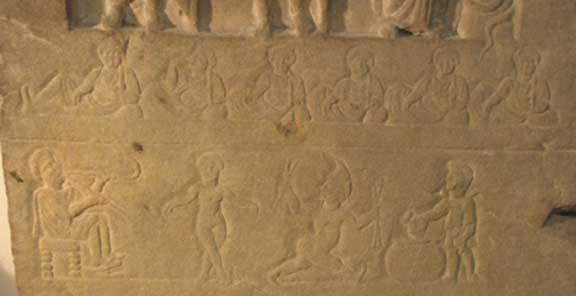 Even more interesting is the rare picture of an association’s banquet which is depicted under the benevolent protection of the gods. Here we see a number of members of the association reclining for the meal in a customary manner as they watch a female dance, perhaps performing in honour of the gods. She is accompanied by a seated man playing a Phrygian flute and a percussionist (using reeds) while, off to the right, a man takes care of the wine bowl for the symposium (drinking party).