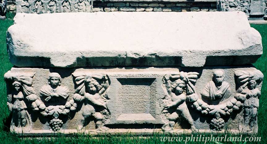 Sarcophagus with busts (of deceased), garlands, and inscription (Aphrodisias)